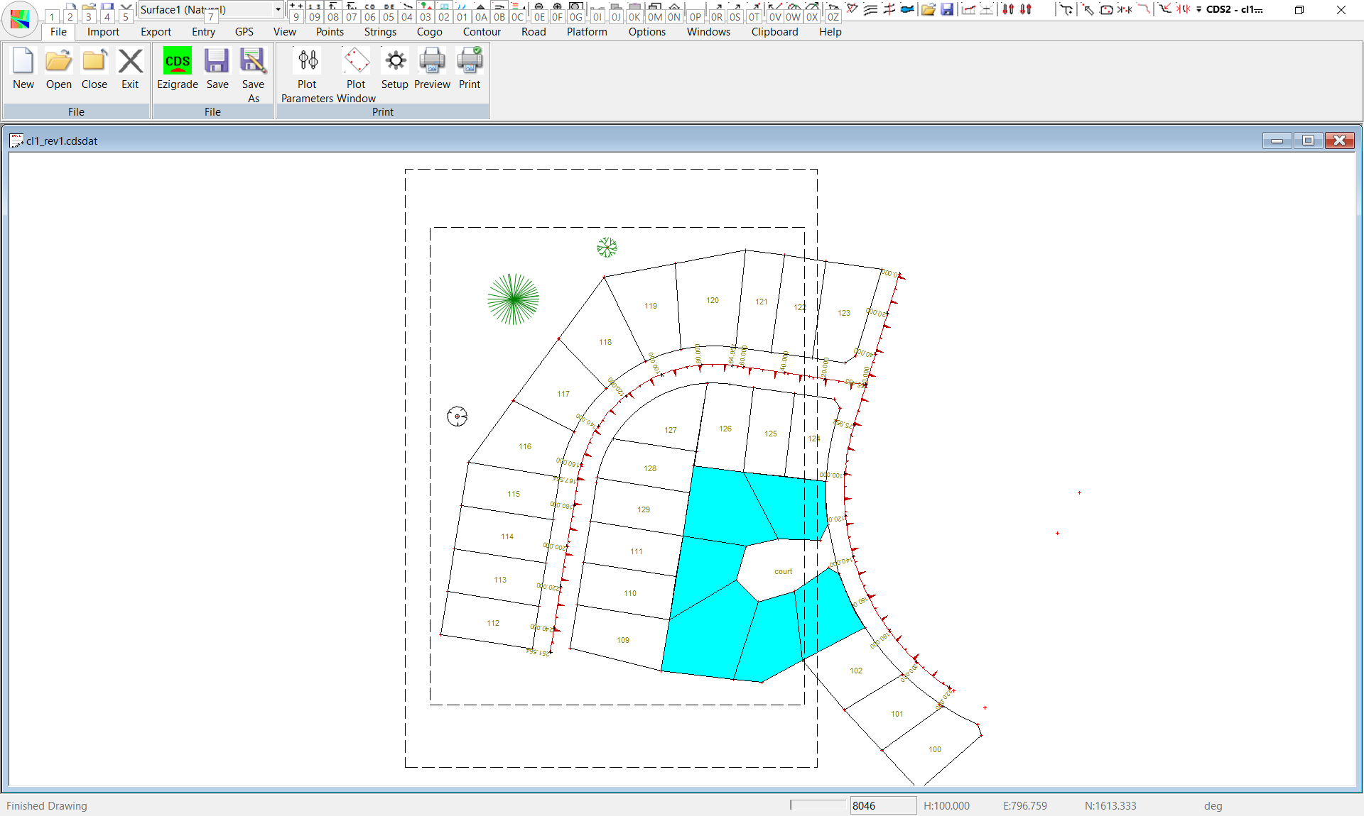 Creating a plan print directly from CDS is relatively straight forward. The following shows you what to do. If you open up the job "cl1" in the tutorial directory we will have something to start with. At this time it would be worthwhile reviewing the tutorial on string attributes to refresh your memory on how to fill in some of the closed strings. How to display "string ID's" as well as how you would display chainages along the road strings (Stn equations if you are from North America). In this example I have also clicked in some randomn points along the western boundary and attached some tree symbols to these points. See the tutorial "Feature coding, symbols and text" for a refresher on how this is achieved. You should be able to achieve something similar to that below.