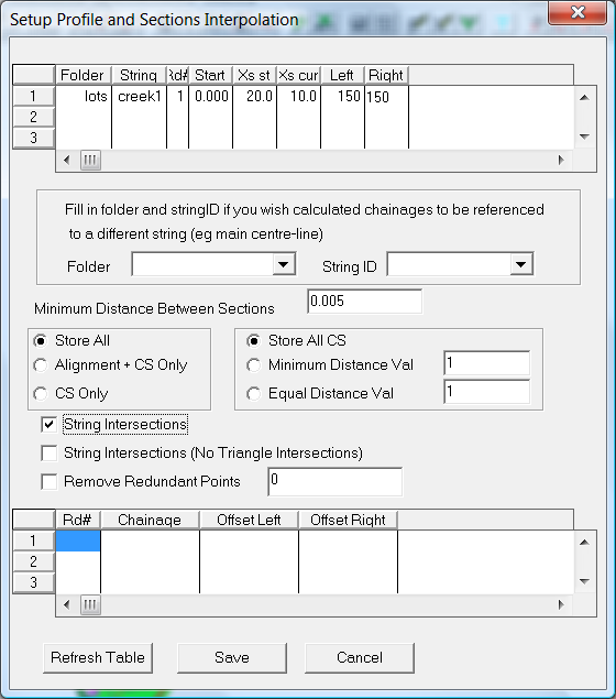 (2) Run the "Contour" - "Interpolate Profile and Sections" menu item. This comes up with the following dialog. You need to set the distance between sections and the distance left and right. Make sure the distances left and right is wide enough to contain any water flow.