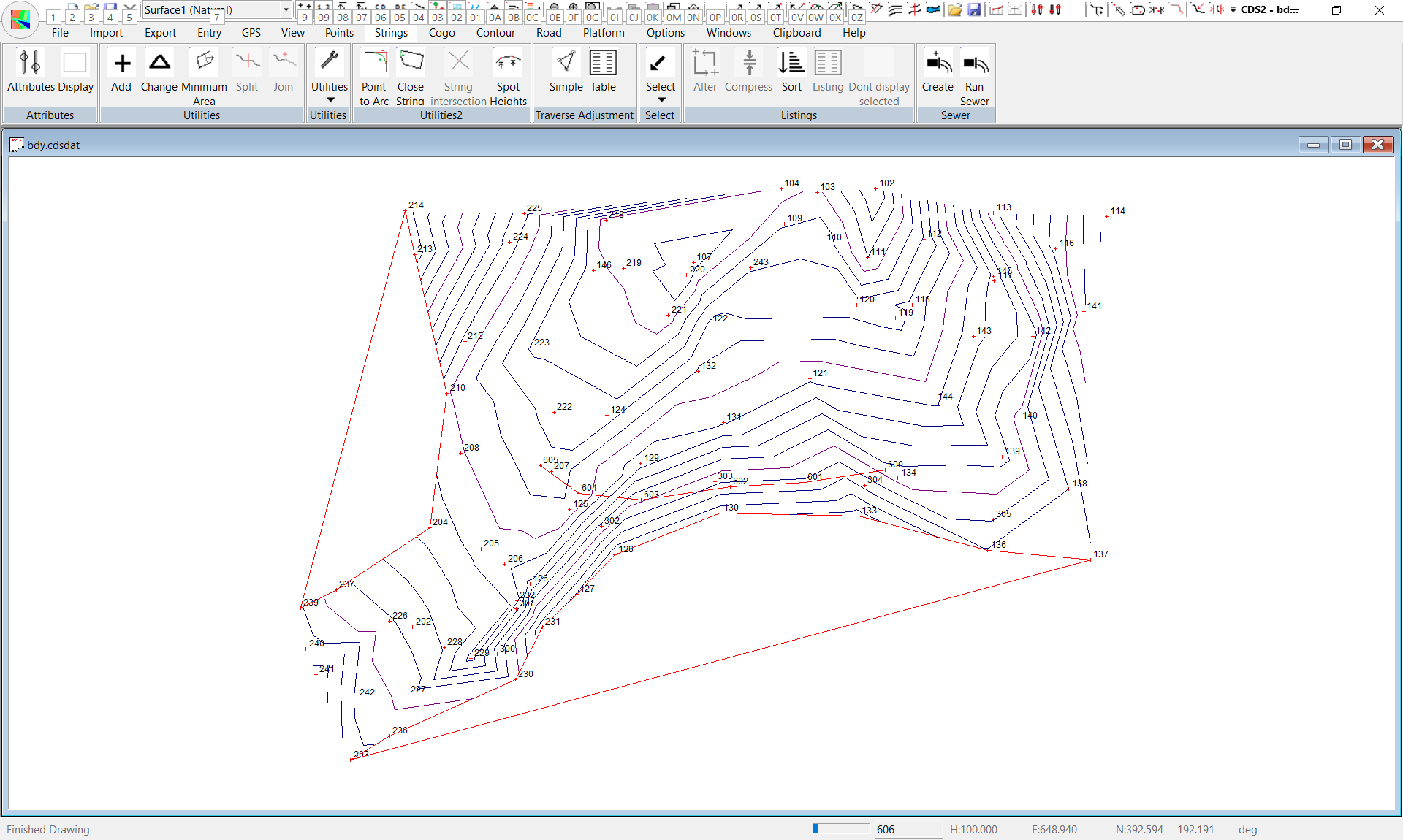 We have already included the string defining the plan view for the water pipe. It is found in the "lots" folder with a name of "pipe". It runs from points 600 to points 604 and is shown in red. To create a vertical design for our pipe we follow the procedure below which has been covered in previous tutorials.