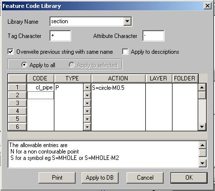 To help in the display of utility sections you need to fill in a special feature code library called "section". This tells the road sections view how to display the appropriate symbol in section view. CDS is supplied with a special symbol called circle that represents a circle that has a diameter of 1 meter. The feature code library can be filled in as follows:
