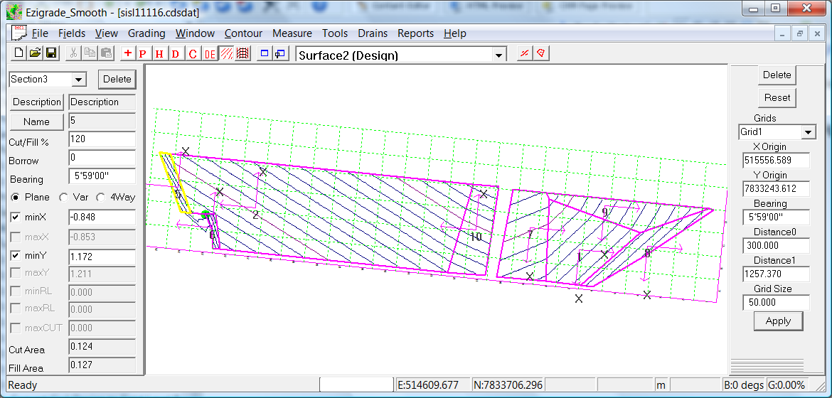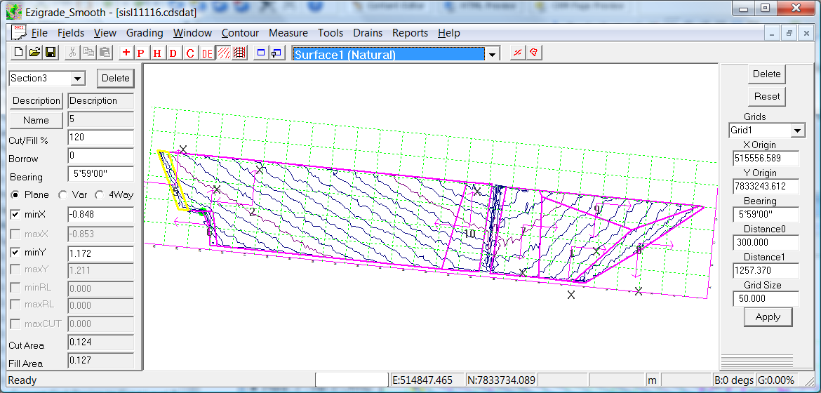 Here we design the grading first and leave the area for the drain blank. In this tutorial we will start with the grading design already done. If you need help with this process; then please refer to some of the previous tutorials on how to do this. We are starting with the following natural surface. You can see the drainage easement that we have ignored for the initial design.