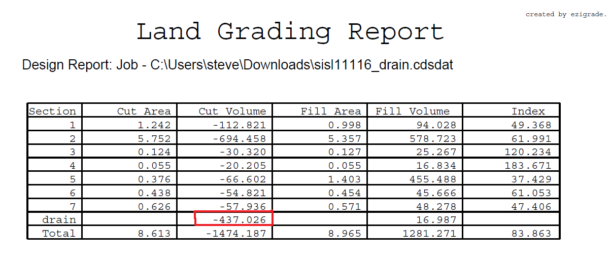 The next step is to create a report that includes the drainage etc. Use the "Reports -> PDF Combined Report". It includes the volume of dirt that needs to be removed or if a bank to be filled. It is worth checking that the total volumes balance. If not you can add borrow to some of the fields when grading and iterate the process.