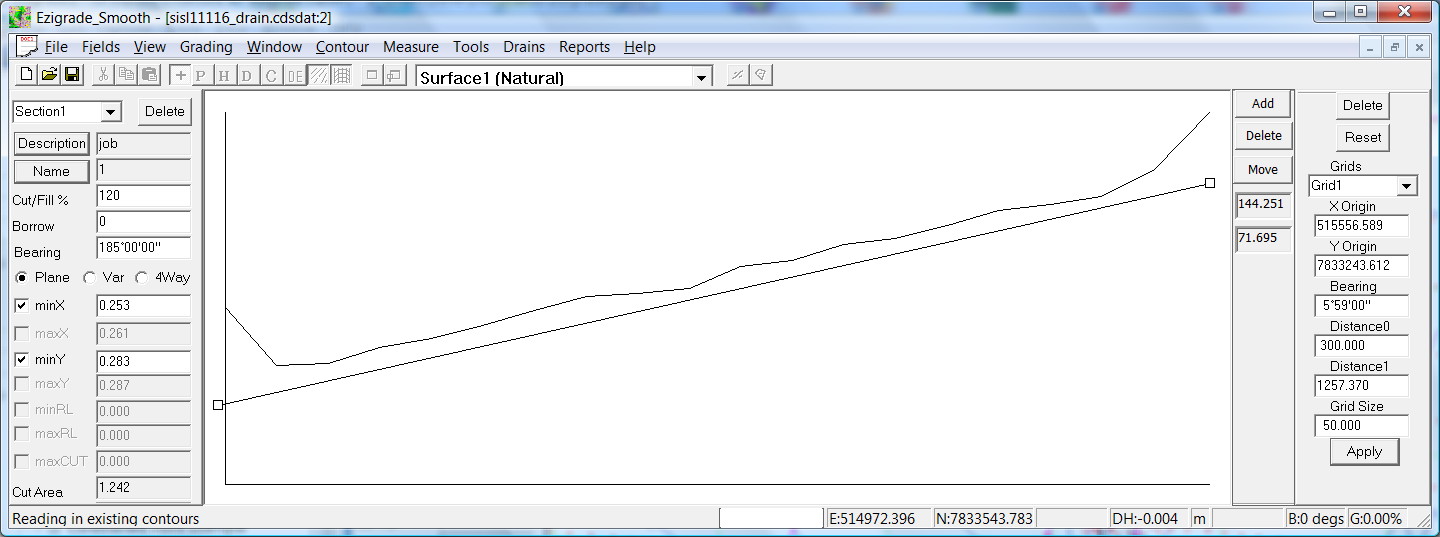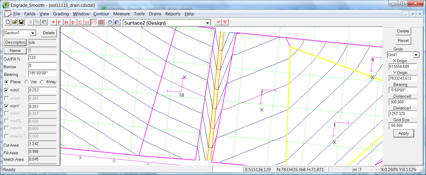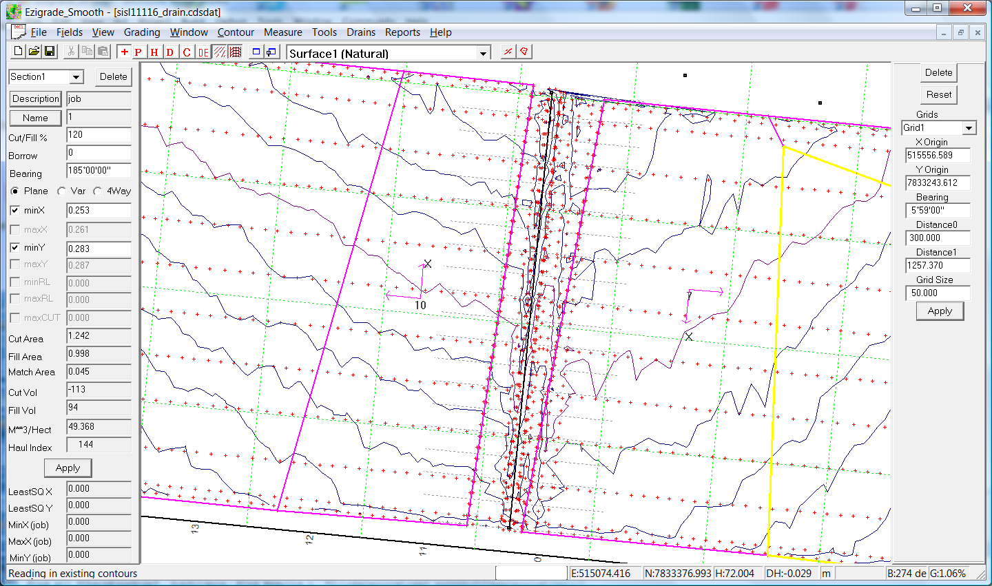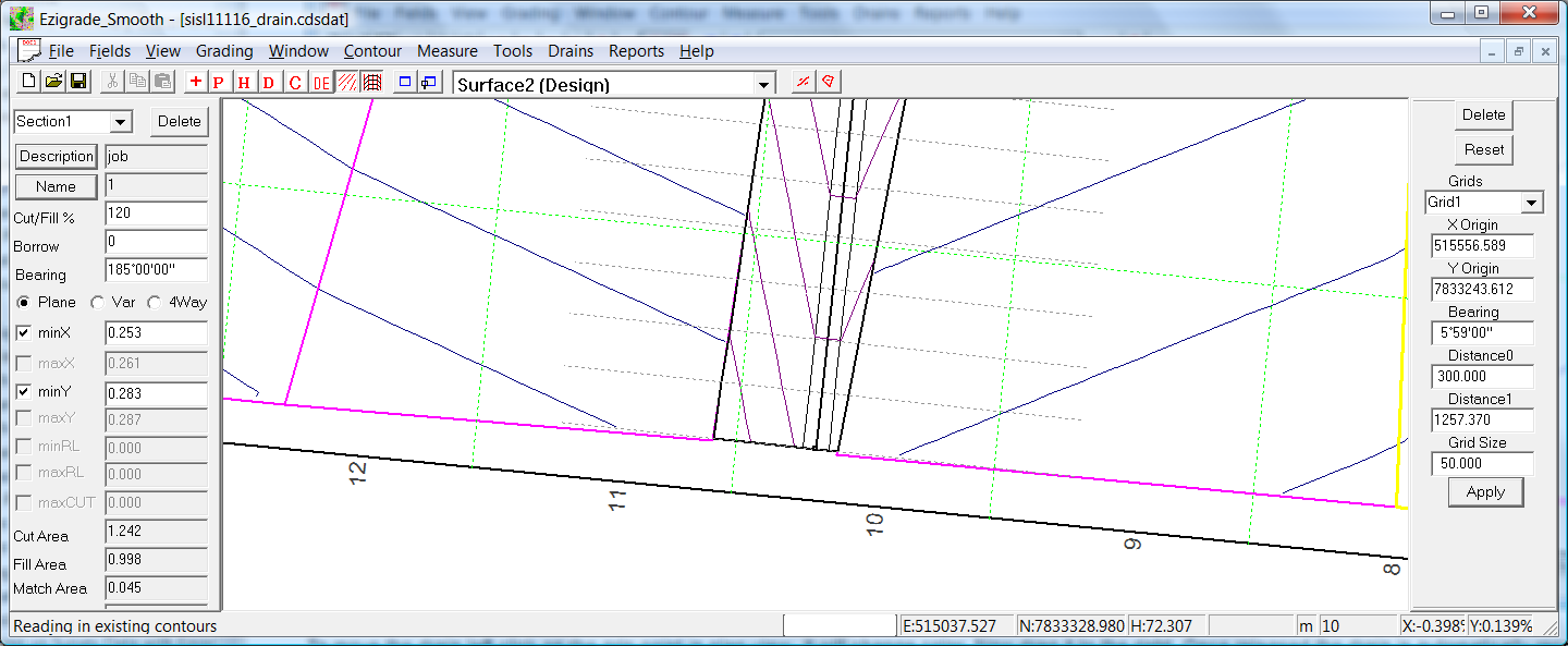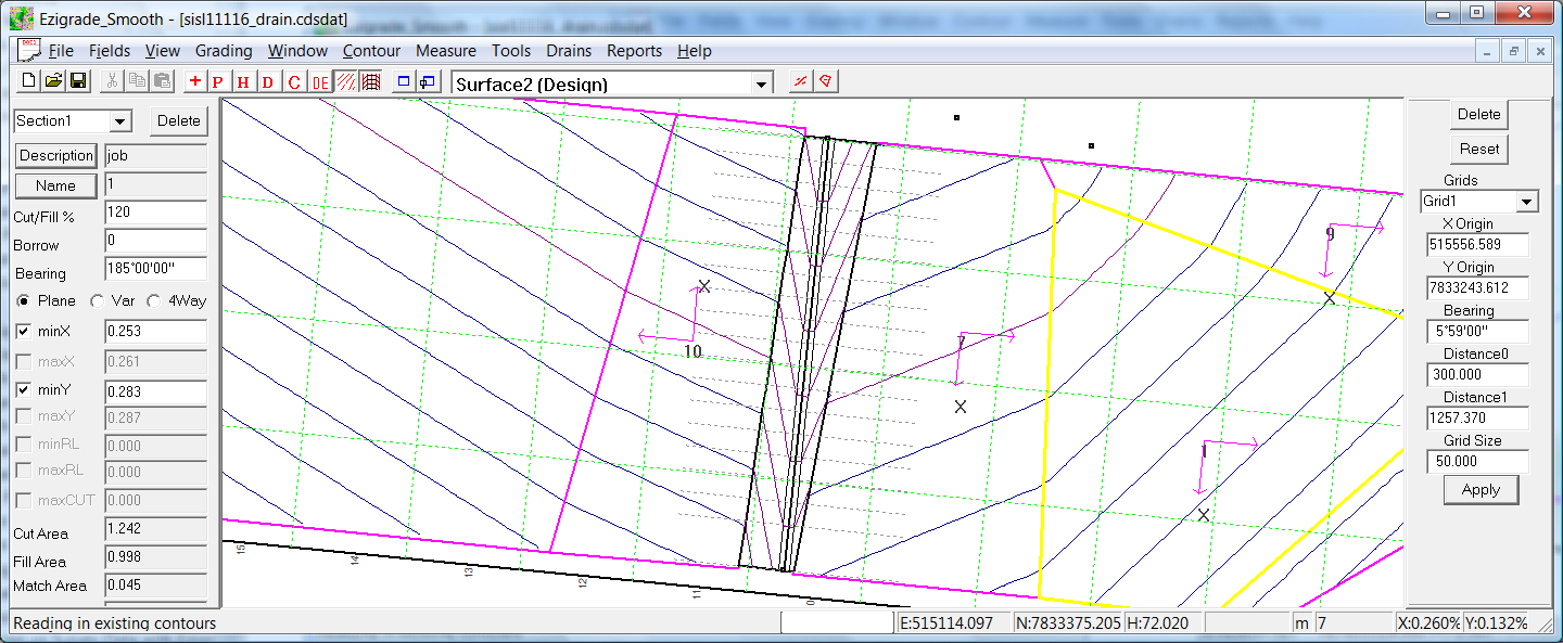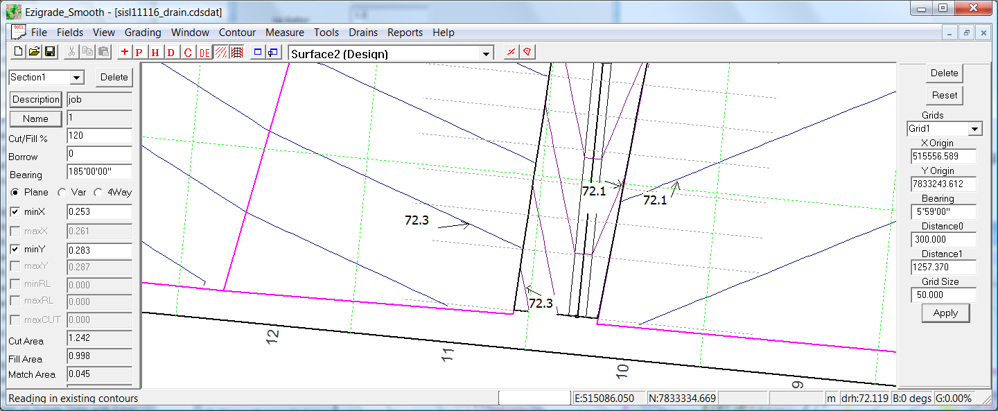 We are now happy with the design. The next stage is to create a finished design surface. Click on the  "Drains -> Merge Drain into Design" option. As a user you don't need to know this but: Ezigrade puts in extra points into the database along the edge of the bottom of the drain as well as the daylight points. Any existing points within the drainage corridor are made non-contourable and breaklines are added along the drain so that the triangles form correctly. Unclick the "Show Drains" icon so that we can view the base surface underneath. If for any reason you are not happy with the result; then simply click the "Drains -> Unmerge Drain Design" and the design surface is reset to what it was.