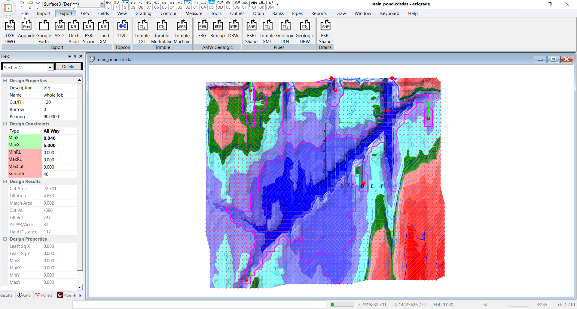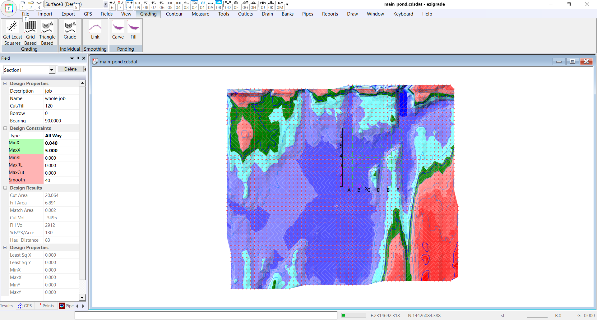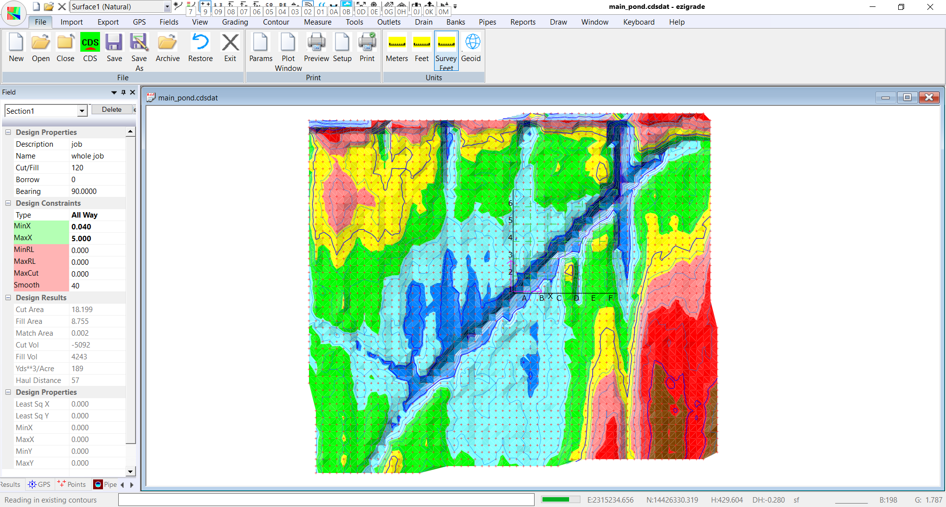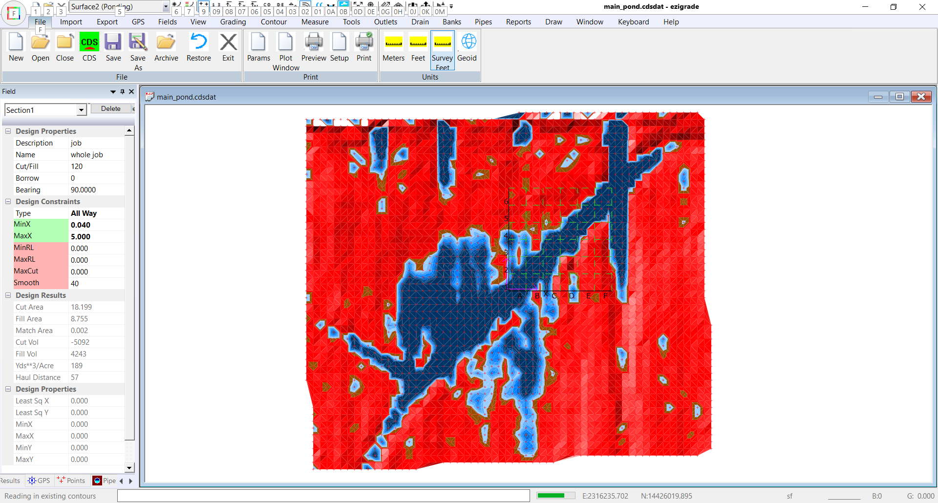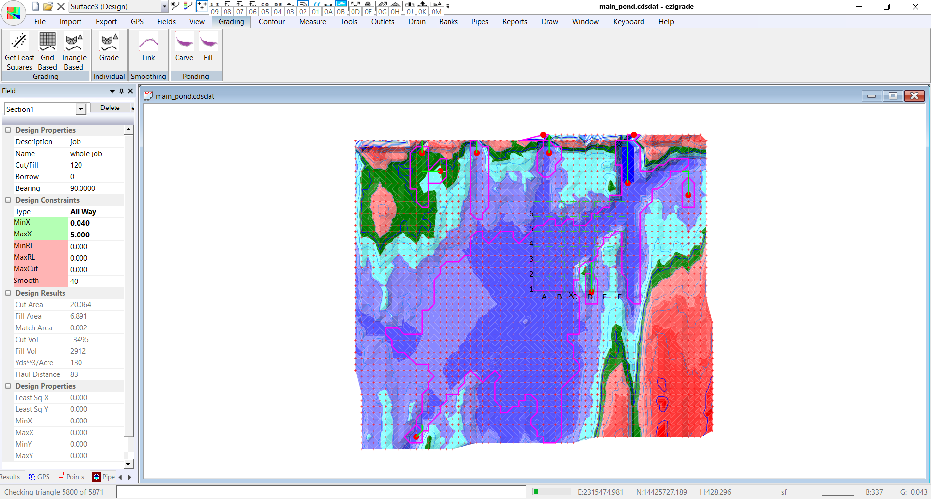 Now run the triangle based grading again. The volumes now are -896/747 and 33 yds**4/acre. So in this job it is more beneficial to carve exists rather than fill ponds. This is because we have this huge pond.