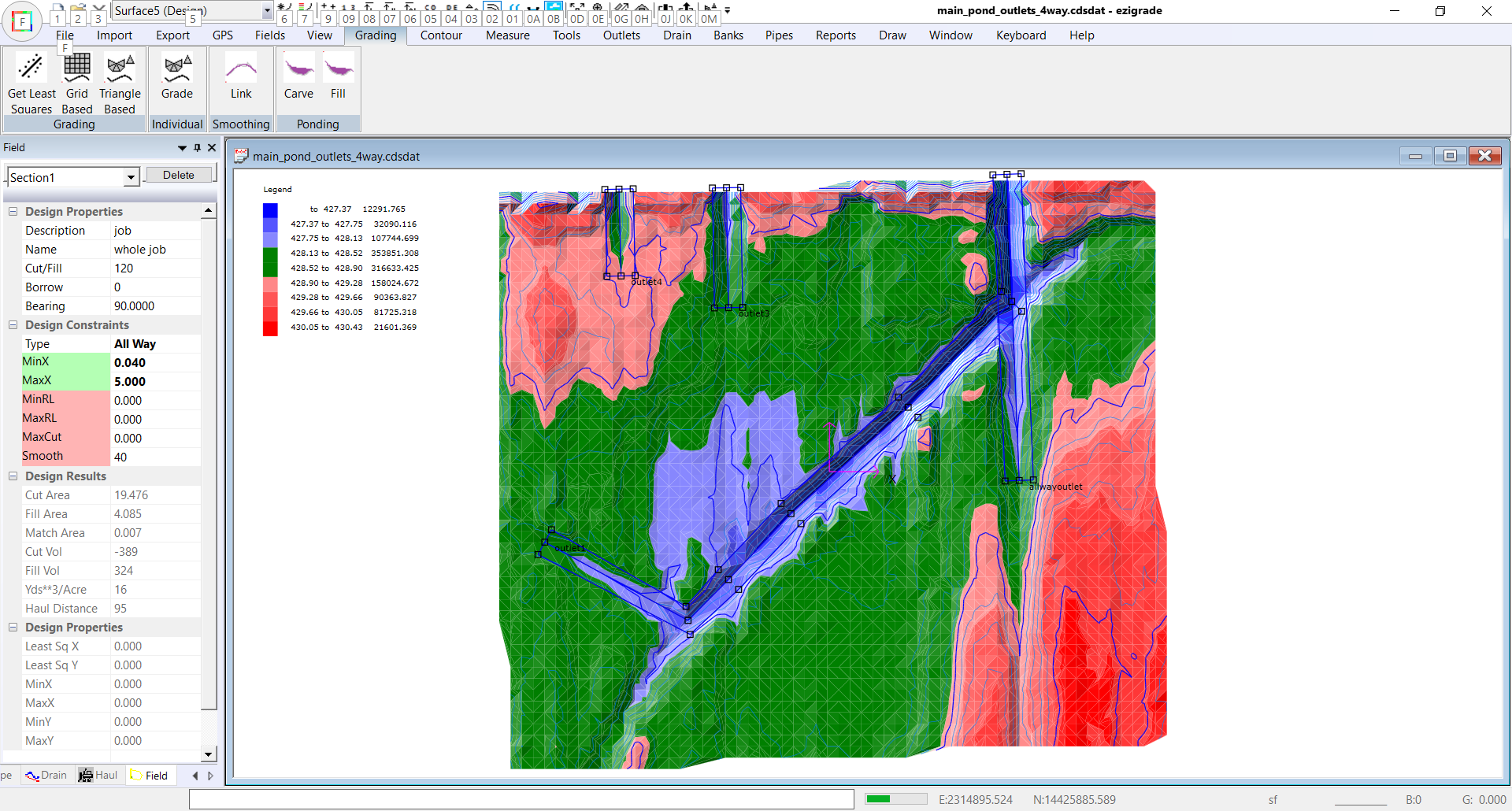 Ezigrade has three types of grading designs. We have the traditional plane design, a constrained grade solution where the grading can vary between limits and what we call an AllWay design. This is a depression filling algorithm often used in the GIS community that makes all the water flow to the edge of the job. The procedure is to first pass a filter over the surface to smooth out hills and hollows etc. Then a back filling algorithm is applied to either fill in or drain or both to any ponding area to a minimum grade. Unlike the constrained grade solution the back filling / draining algorithm does not always result in a minimum solution. So it is possible that absolute volumes could be higher than a totally user designed system. However the procedure is certainly less involved and it may be easier to take the computer generated solution.