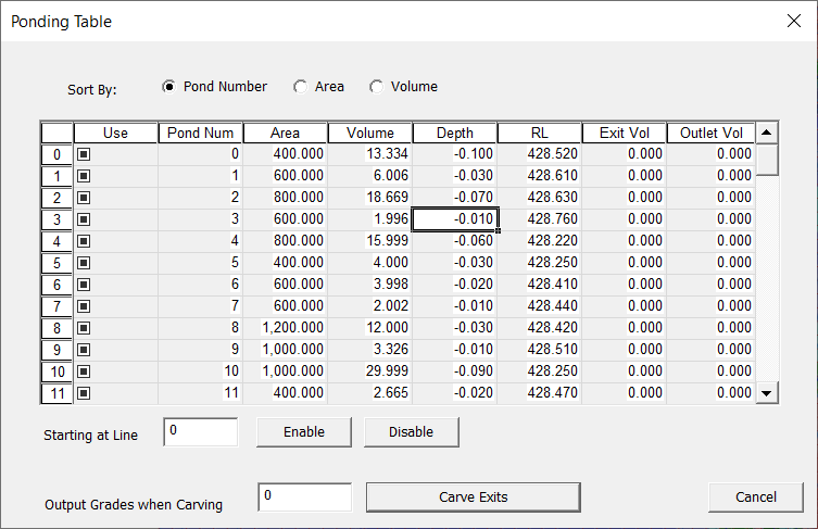 There are 88 individual ponding areas. A lot of these are trivial so we want to ignore them. Looking at the ponding surface I would suggest that 10 of the ponds are worth draining. The rest can be ignored. So I put in 10 to the "starting at line" and clicked disable.