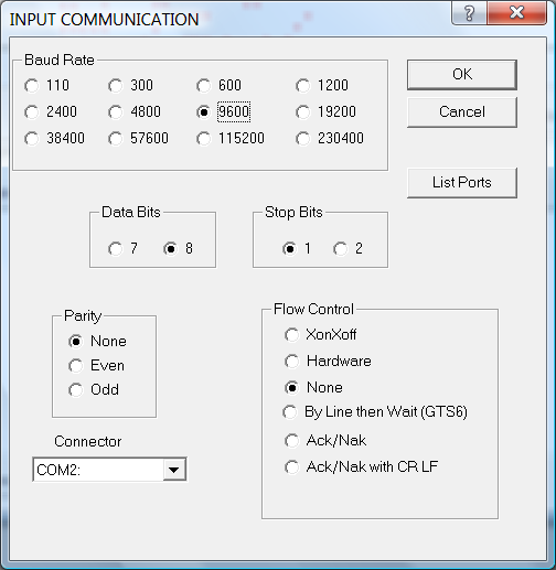 Once you know the serial port number click on the "Port" button, and fill in the appropriate connector. I suggest you set the data bits, stop bits and parity as below and set the baud rate to the same as the Igrade system.