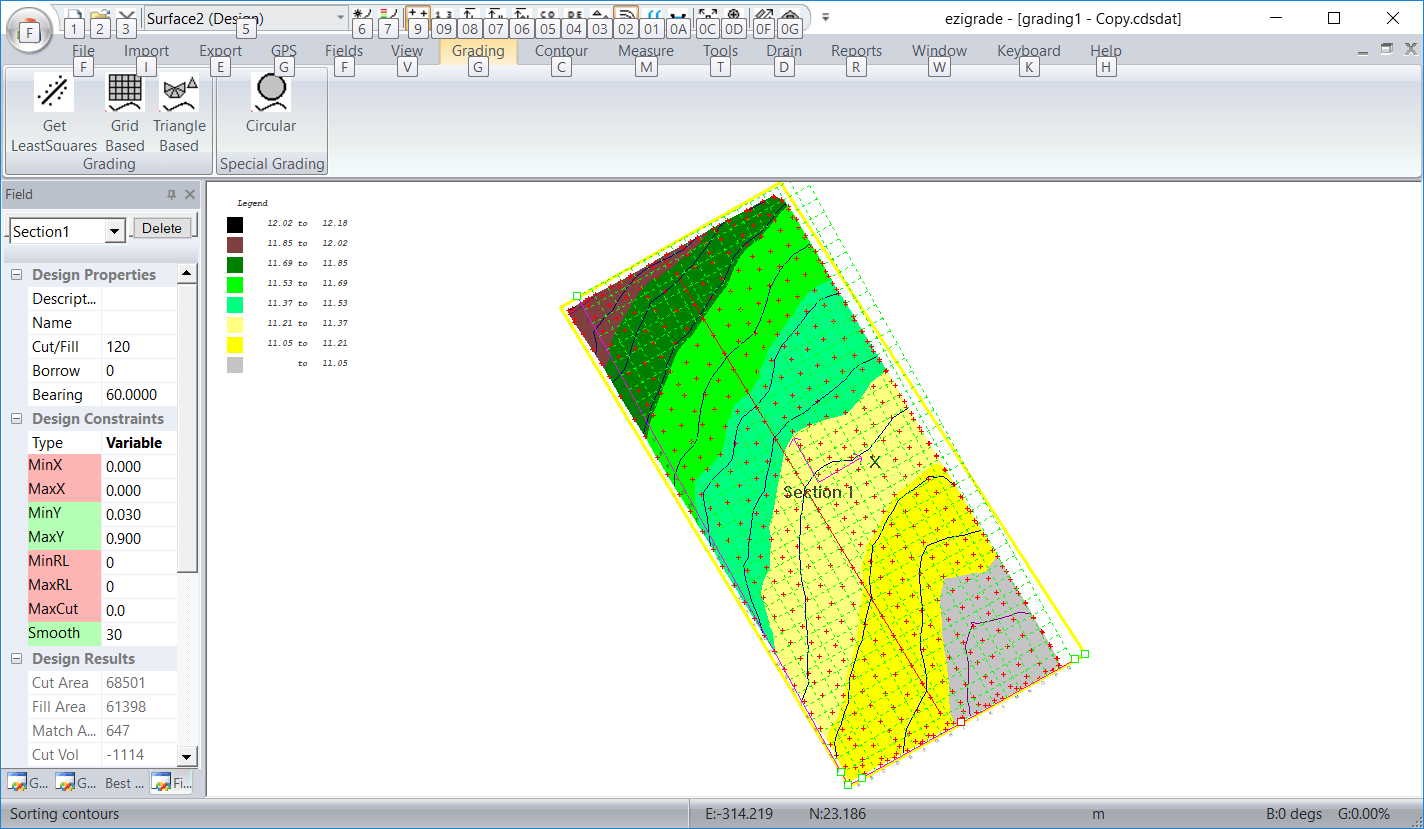 For a smoothed surface of best fit the procedure is the same as for creating a plane of best fit. You first need to setup for each section the grading parameters. If you look at the picture below :