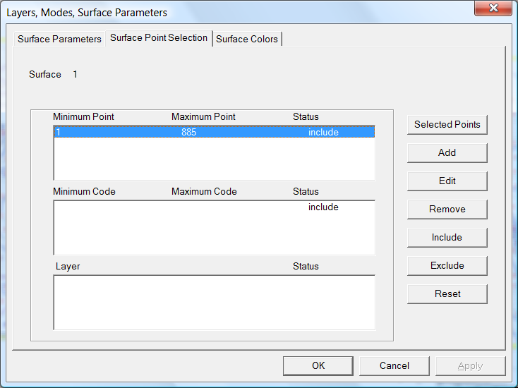 The surface parameters allows you to define the functionality of the surface. Which points are used in the surface etc. There are three tabs across the top which allows you to set parameters for "Surface Parameters", "Surface Point Selection" or "Surface Colors".