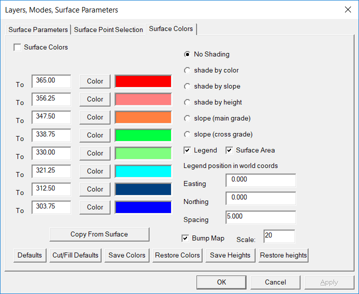 The "Copy From Surface" button will copy the values from one surface to another. Often you setup surface 1 at predefined intervals and colors. After grading when a new surface is formed these height values are calculated automatically by Ezigrade. Once we look at surface 2 colors; by clicking the button we can copy these predefined values directly from surface1 into surface2. This makes it easier to compare actual heights around the job.