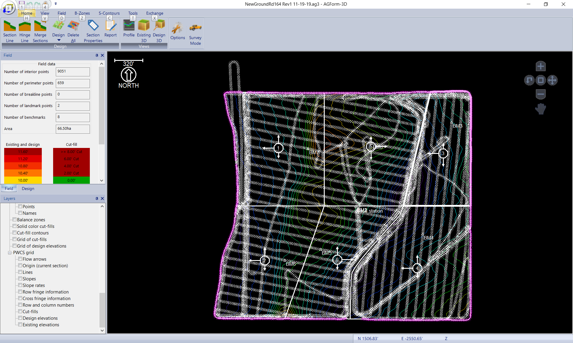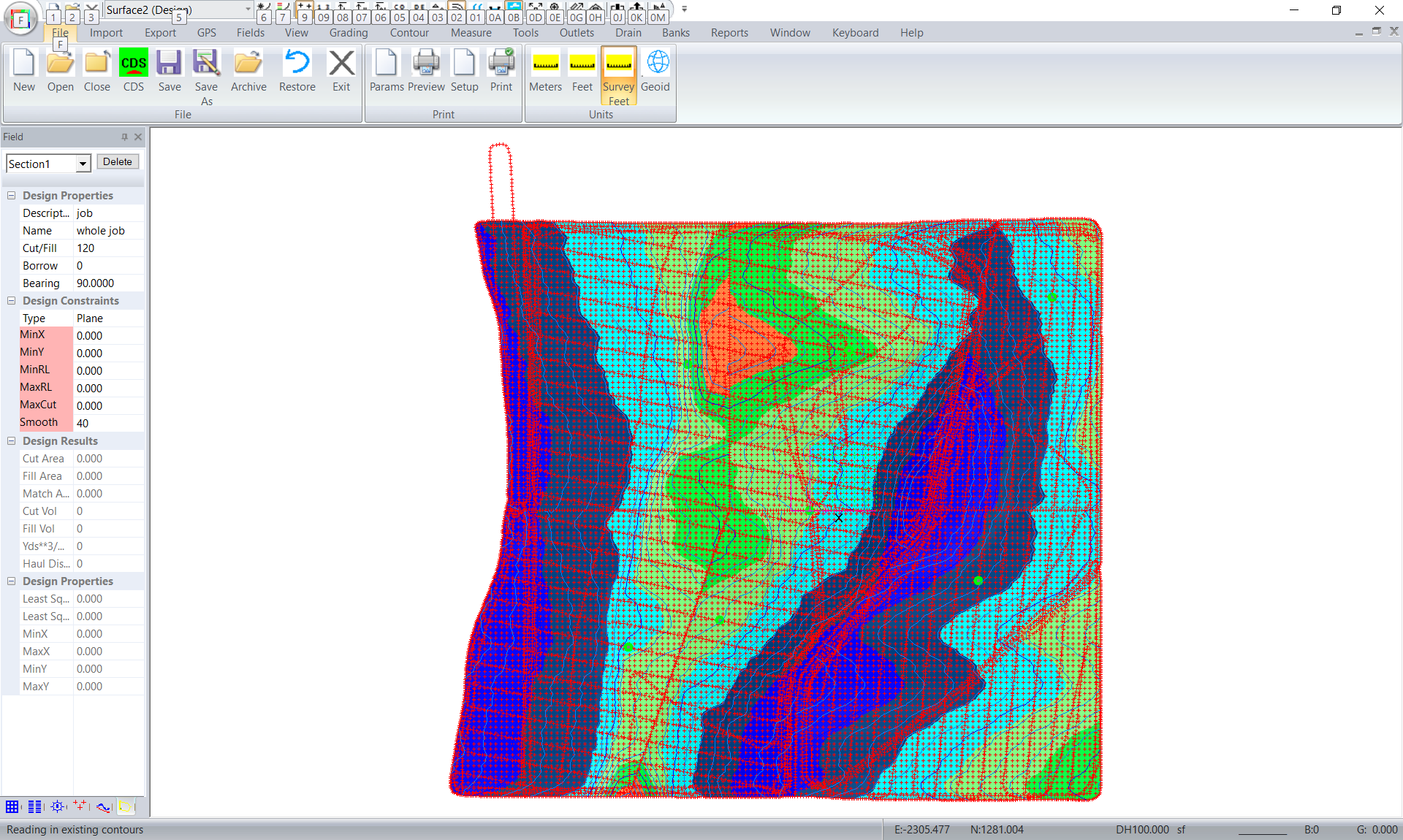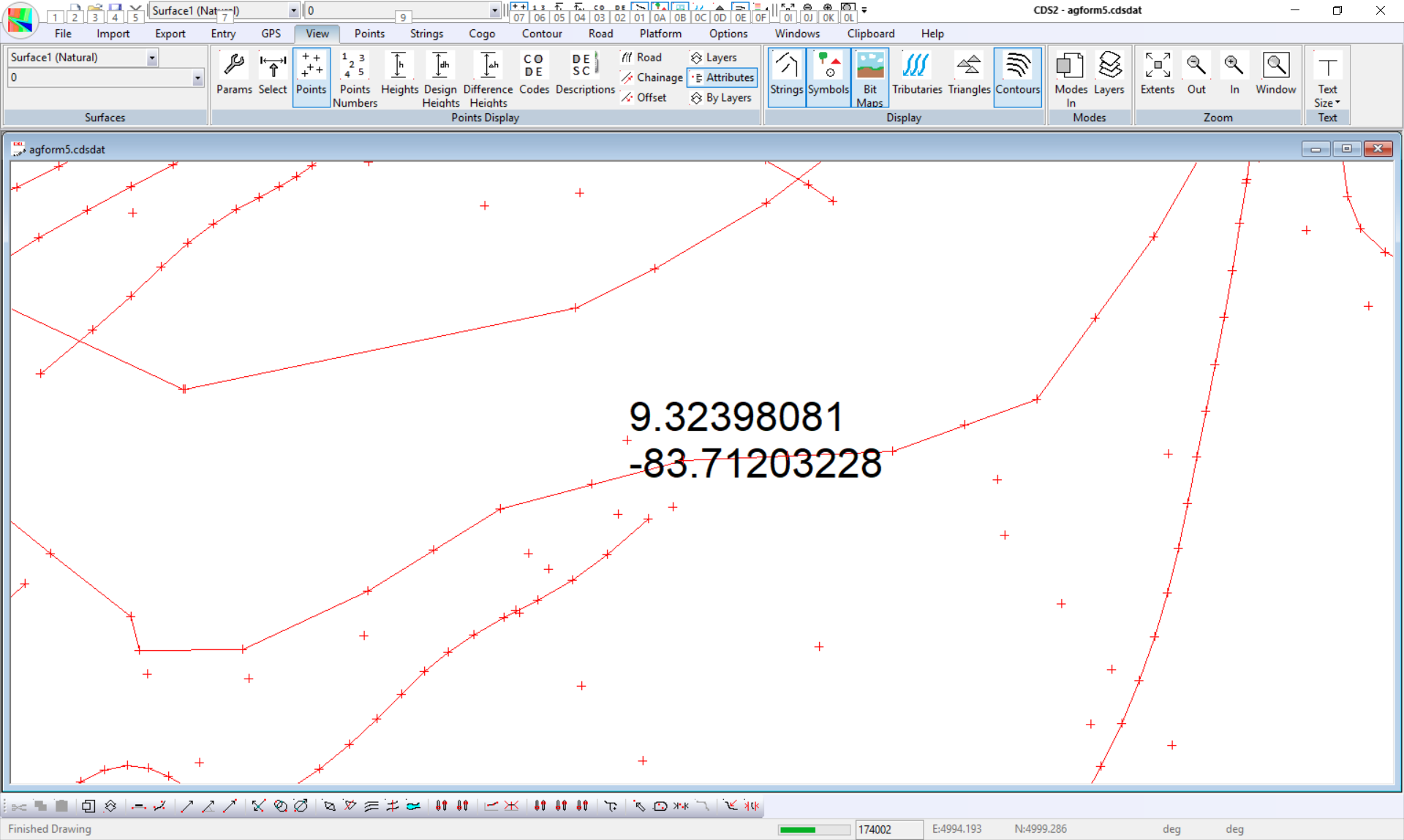 Ezigrade imports as much data as it understands from the *.ag3 file. The file format is undocumented. At present Ezigrade imports points, triangles, bench marks with latitude/longitude, strings that it recognises. At present we don't try to understand sections, designs etc - only the finished surface etc. If you would like more data extracted please contact us with your requirements. After doing the import we get: