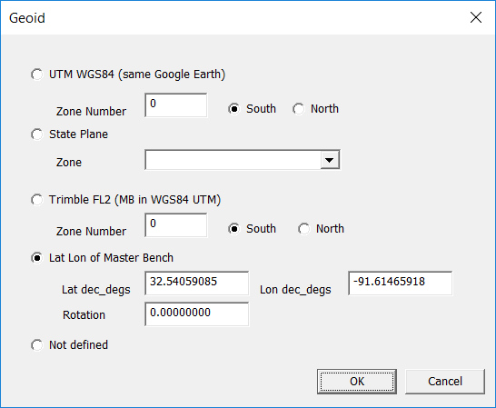 The Latitude/Longitude of the Master Bench will be filled in. If this is filled then Ezigrade can prefill directly some of the entries in the "Export Trimble GPS" dialog. Now click on Export -> Trimble GPS. Note that the "Lat Lon of MB" is used and the Lat and Lon are filled further down. If these are not prefilled, then close down the dialog. Make sure you have a "MB" point. Now click of File -> Geoid and enter a Lat/Lon value for the Master Bench. We have the following dialog: