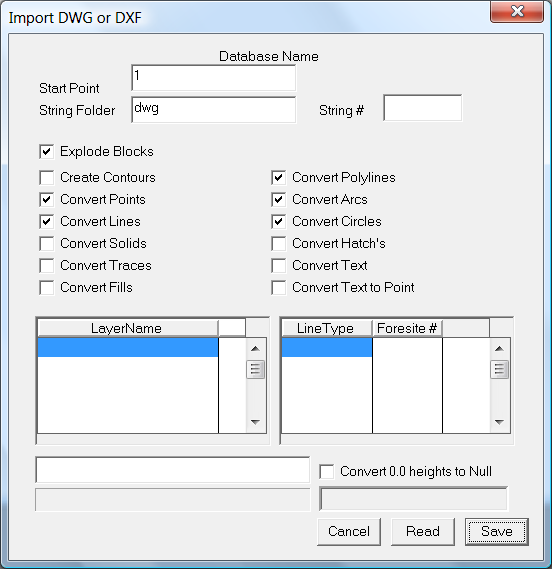 To import this data use the File - Import DWG/DXF menu item. You will get the following dialog. Click on the "Read" button and the DWG is read in. Once the file is read into memory you are given a prompt message. Now click on the "Save" menu.
