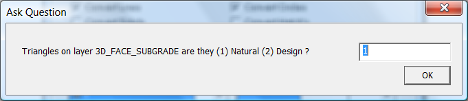 For each series of 3D Faces you are prompted on whether the surface is an existing surface (natural) or is a as-built (design) surface. If you get it wrong first time through simply run it all again. If you are importing a LandXML file you are also prompted on what type each surface is. The prompt you will get is seen below: