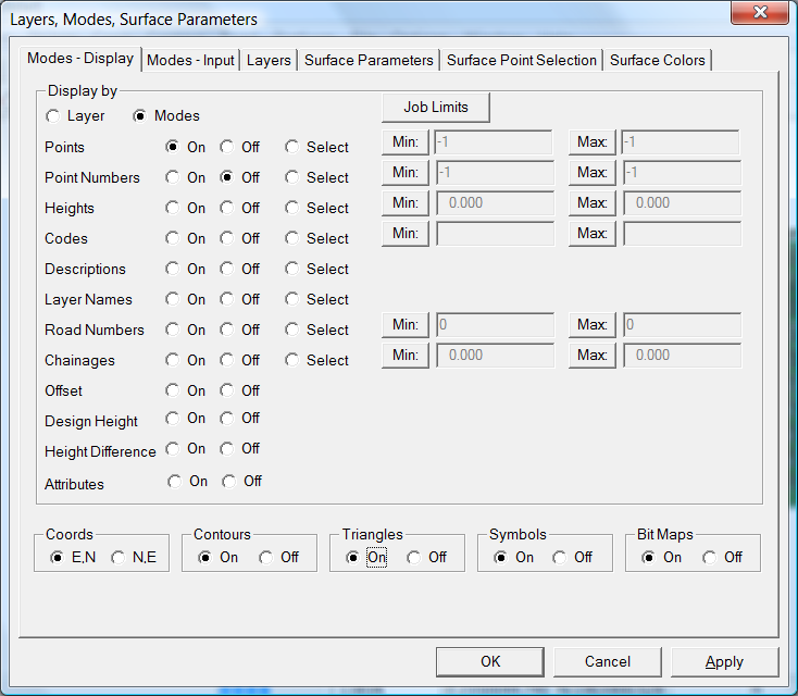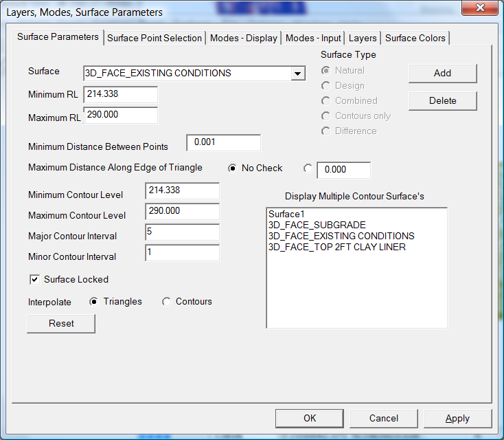 To change the surface to display, click on the "Contour" - "Surface Parameters" button and look at each surface in turn. It would also be useful to create some contours as a check of how representative the surface is. For example change the surface to "3D_FACE_EXISTING CONDITIONS". I would also suggest changing the contour intervals to 5 and 1 respectively. The default values are too close.