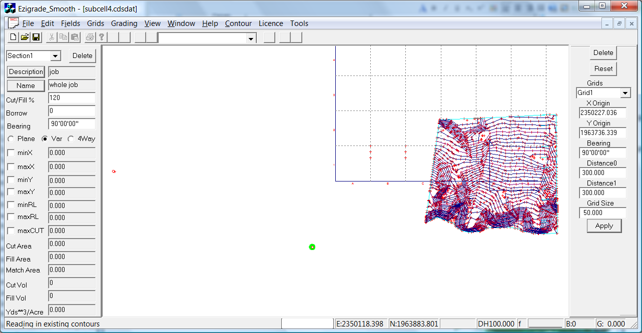 This DWG contains some extranous data that is not really needed. ie The contours which come in as string-lines. In this example we can tell CDS and hence Ezigrade to not display the string lines. However it may be handy to keep the blue string that defines the outline of the job. I suggest that you check the triangular surfaces before continuing.