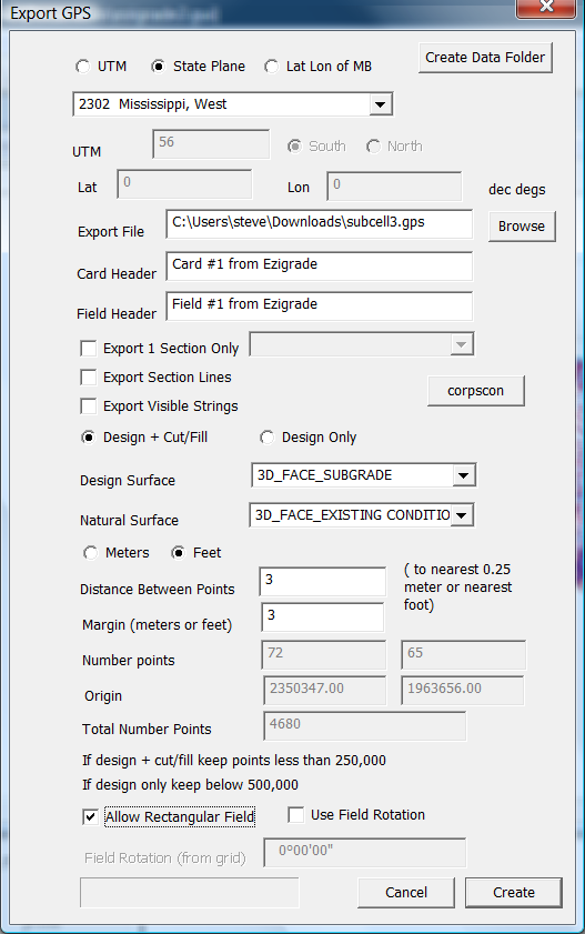 In this example I suggest that you fill in the dialog as above. In this case we have the data in State Plane coordinates so make sure the state plane radio button is set. From the drop down menu select the "Mississippi West" option. If you don't know the coordinate system we suggest that you set the format to "Lat Lon of MB" and then enter the lat and lon of the Master Bench in decimal degrees. Click on the "Browse" button to create a new "Export File". Select the appropriate Design and Natural surface. Further down you need to set the distance between points in the grid and the appropriate margin. Keep track of the total number of points that will be generated. Normally the closer together the better that keeps the number of points below the maximum that will fix. The .gps file format is a very old format that is a fixed size.