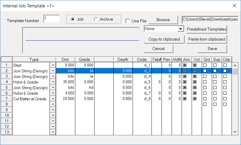 Click into the section view and then right click and select standard templates. Here we have entered a template 1. Lookint at the template. We are going to hang this of the right hand side of the tail drain. We are going to join straight to the left edge of the section. This is the lots le string. Use a type of Join String (Design). It looks up the le string profile. Repeat going tp the re string. Draw in the sill and as a shortcut lets join straight to the left edge of the head ditch. Now draw agross the base of the head ditch and batter up to the natural surface.
