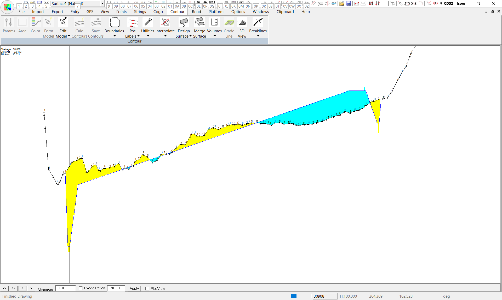 We are now in a position to calculate some volumes. Running volumes Road -> Volumes -> Design Volumes we get volumes of -8539 / 5985. With a difference of 5985 - 8539/1.2 = -1130. So we have too much cut. To compensate we need to raise the area of the section plus the sill. Under Cogo -> Surround. Click in the area to get the area we are looking at. It is 120,900 meters squared. Thus try raising the area 1130/120900 = 0.009 meters.