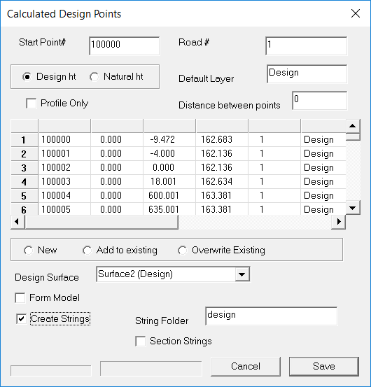 Go to Road -> Design Surface -> Store Design Points. I changed the start point number to something we can remember. If we want to delete what we have done and start again. Also click on create strings. Clicl "Save"