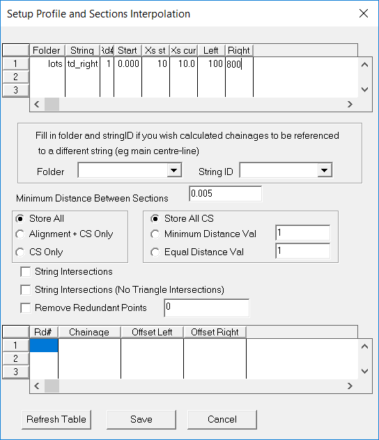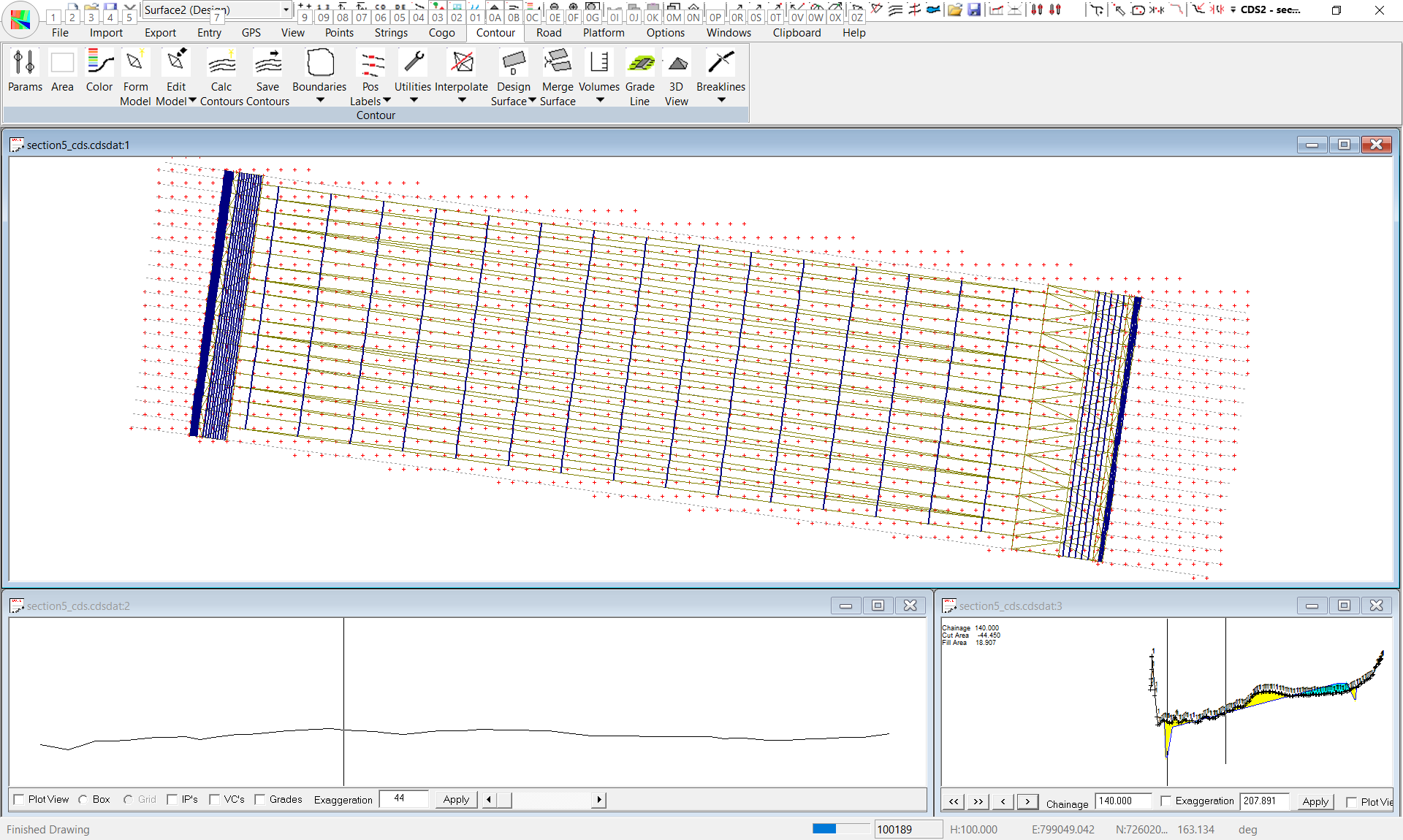 In CDS left click on the table drain string and then run Contour -> Interpolate -> Profiles and Sections. Set the sections to be 10 meters apart and look 100 meters to the left and 800 meters to the right. As long as it covers the design area. Click "OK + Save" to store away the data.