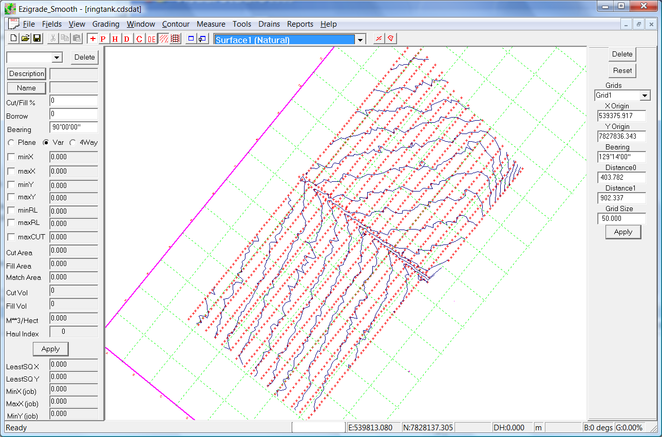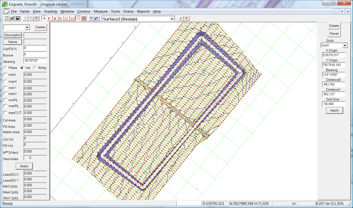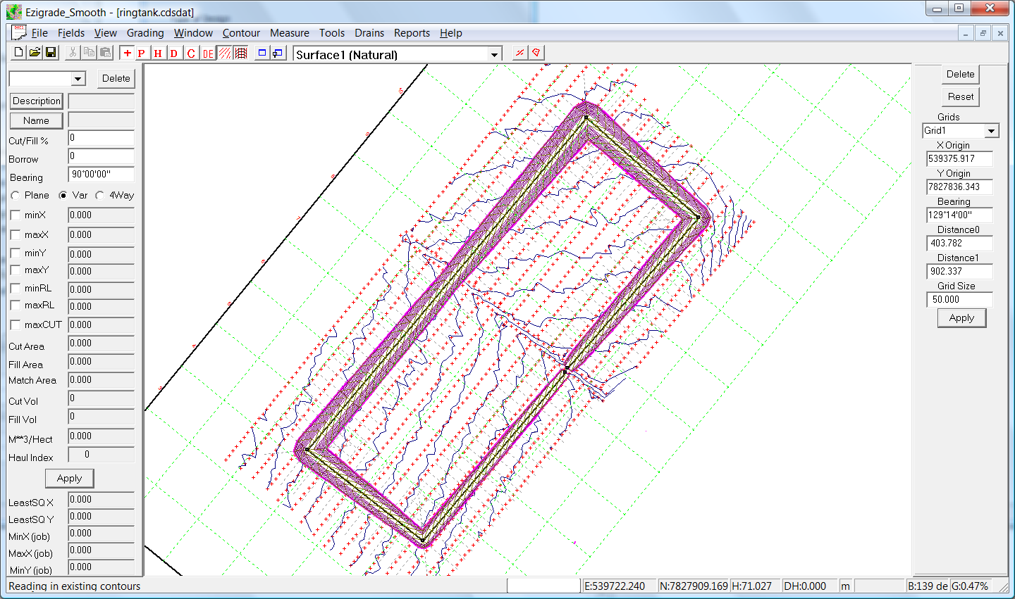 In this example we are going to show you how to use the drainage routines to design a ring tank. A ring tank consists of a bank designed such that it holds water; normally as a farm dam.
