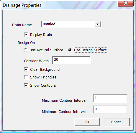 If you click on the "Drains - Properties" menu item you can set some options for this drain/bank. In this bank we need to specify that we want to use a "Design Surface" and that the corridor width is set at 20. The corridor width needs to be wider than the maximum expected width of the designed bank. However this value can be changed on the fly if we need to modify it. Everything is recalculated accordingly.