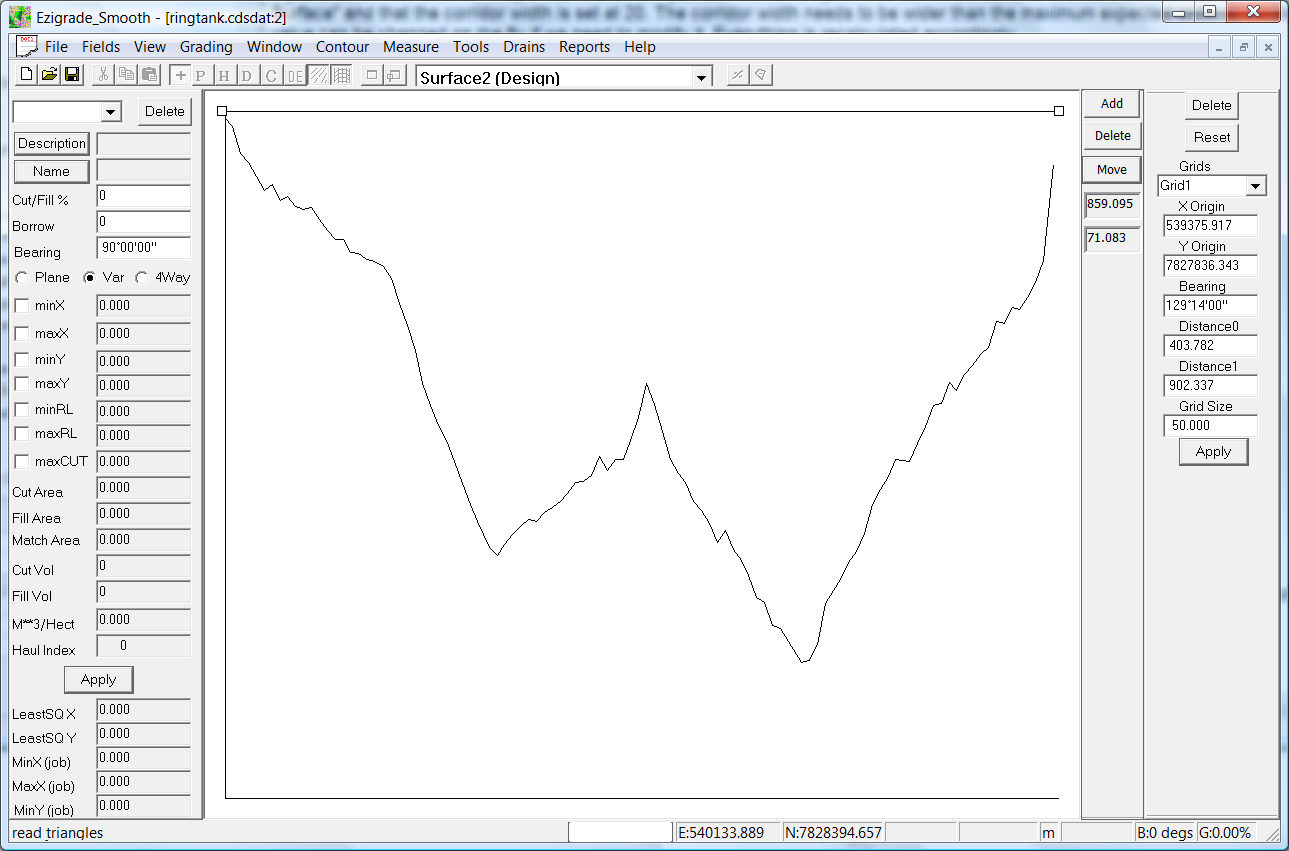 Click on the "Drains - Design Profile" option. We are presented with the natural surface. We can then click in the new design profile. As we are designing a ring tank the height is a constant value. If you look at the screen shot below. You can see the existing natural surface. The design is clicked in at the top; using the Add, Delete and Move buttons. You also can take note of the design height shown when you move the mouse.