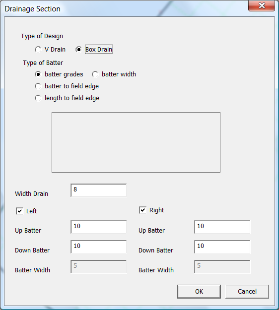 Click on the "Drains - Design Section" and you are presented with the following dialog. In this case we want a flat top on our bank and batter to the appropriate surface. So we have a "Box Drain" type design. The type of batter is just a "batter grade". The width and the batters are entered at the bottom. When happy click OK.