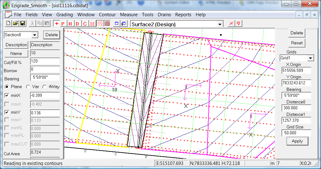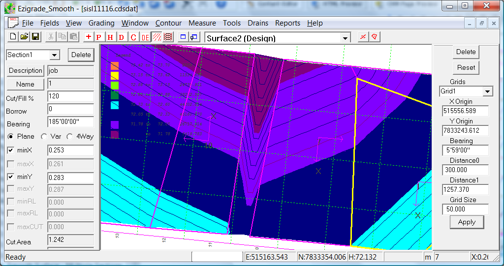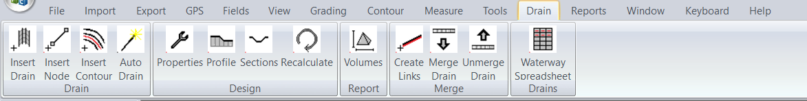 This calculates the drainage design and redraws the drain on the screen. In the example shown we have a drain that match's a grading design running both sides of the drain.