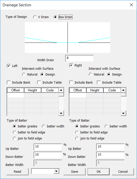 We now specify whether we have included banks on either side of the drain. Tick appropriate box and they are included. Untick and they are not included.