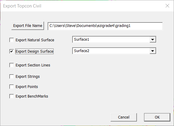 Click on Export -> Topcon Civil. This option creates points, lines etc and including a triangle file. We need this triangle file to get our data into Agform-3D™. Clicking the menu item gives us the following dialog. When entering a "File Name" make sure we don't have any extensions. Ezigrade is going to create a number of files with different extensions. In this case Agform-3D only allows us to import the TN3 file so there is little use selecting any other options.