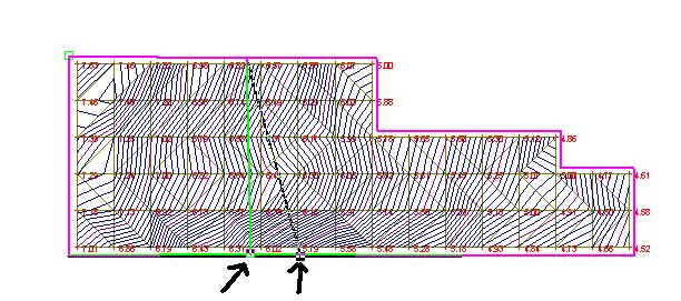 However you can also start a section on an existing node or along an existing edge or link. You can also finish on a node or existing link. This way you can build up an interconnected network of sections that define a number of sections. In this example we wish to split the job into two sections, a left and a right. We have drawn in a new section line from about the bottom middle of the job to the top of the job. Simply start the line on an existing line and finish on an existing line. Ezigrade will automatically snap points on the existing line and create a new node.
