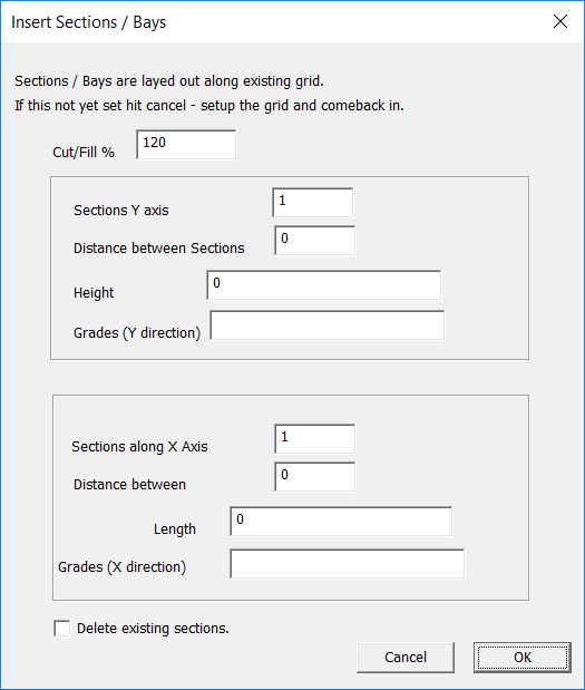 You are prompted to enter Number of sections, Length and Height. You can also delete all existing sections or add to existing. The sections are designed to use the existing defined grid. It takes the origin and lays out the length along the X axis. The sections are added in along the Y axis.