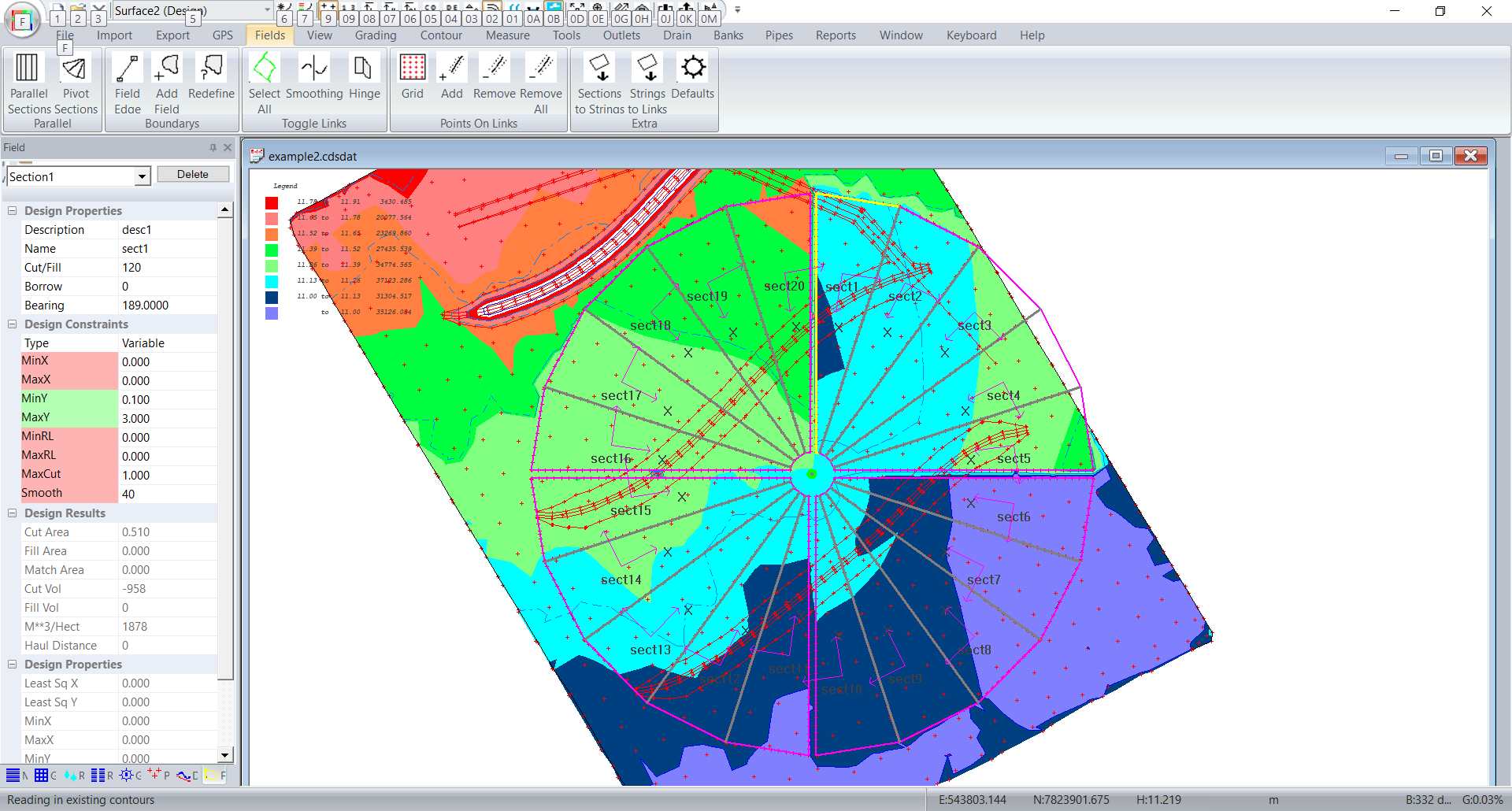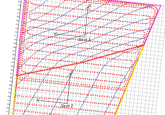 There is no need to define a section if you wish to grade the whole field using the same parameters. If you wish to define only a certain section of the job then you can create a section. It is simply a closed area. It has a number of defined lines that make up the outside of the field. The field has a number of parameters associated with it such as cut/fill ratio etc.