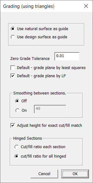 If you are doing planes of best fit then tick the appropriate tick box for either doing a "least squares" solution or alternatively a "linear programming" solution. The least squares solution calculates the plane of best fit by minimising the sum of the least squares difference to all the points in the job. The linear programming solution consists of putting all the points into a mega-big matrix and manipulating it to mimimise a function that approximates the total cut volume.