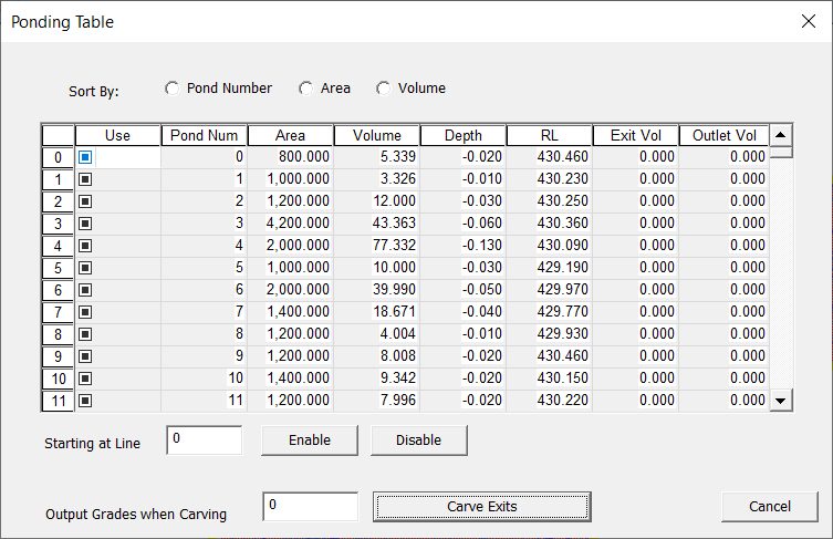 With a pond it is generally better to carve an exit for a pond with a large volume. However you would normally want to fill a small pond that would involve a large volume to carve an exit. With this table the user has a method of defining what they are after. Click on Volume to sort by volume. You can then enable or disable ponds. If enabled we do a carve. If not we do a fill and the pond is ignored.