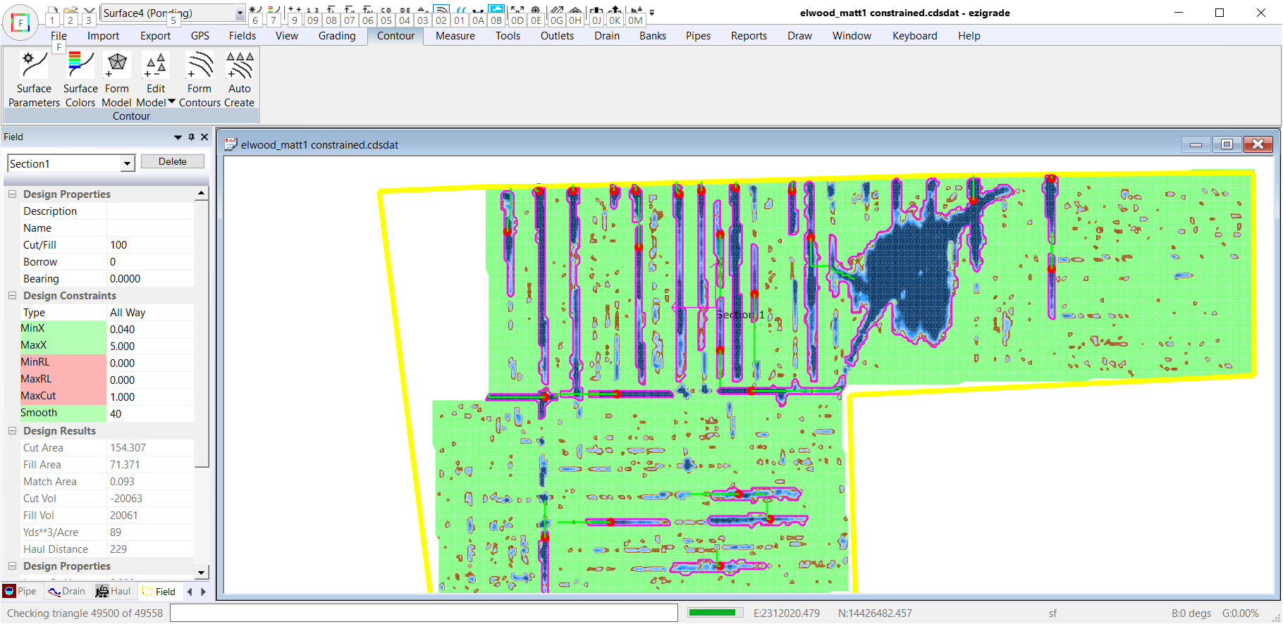 After the field is graded so that either a plane or constrained grades are produced you have the option of smoothing the surface. This is a bit like running a fine grader over the surface. Smoothing the surface is a good idea as it reduces change of grades and leads to better water run-off.