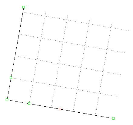 You can modify the grid graphically as well. Do this by left clicking the mouse while having the cursor lay along one of the grid axes. A number of handles/drag points are enabled. They are highlighted as green squares. One of them is red. To change the current position of the grid click in the lower left square and while keeping the left mouse pressed; simply move the gris. It will follow the cursor. To change the extents left click in the squares at the end of the grid. To change the cell size click in either of the squares 1 cell width from the origin. To change the rotation click on red and move – grid rotates with the cursor.