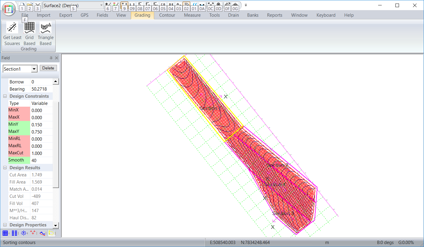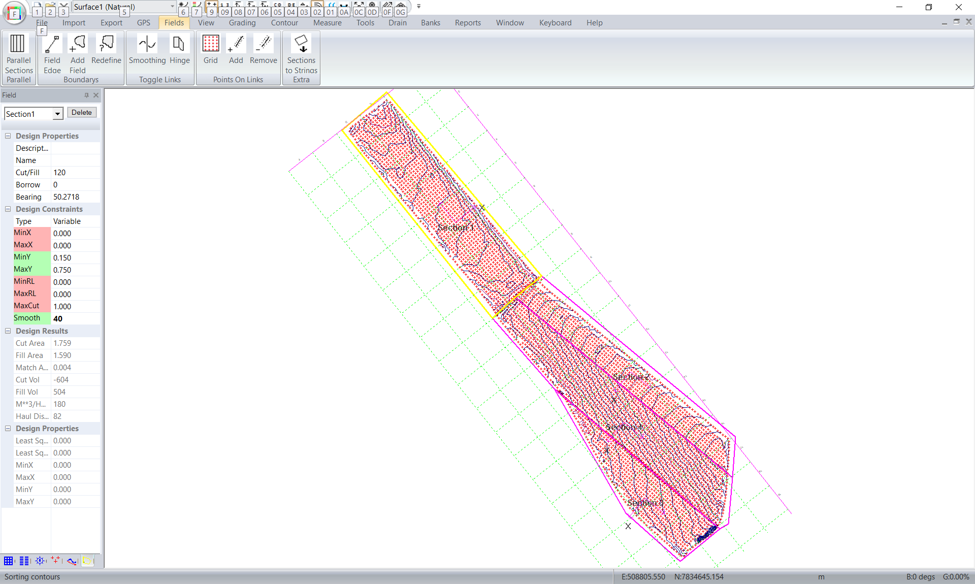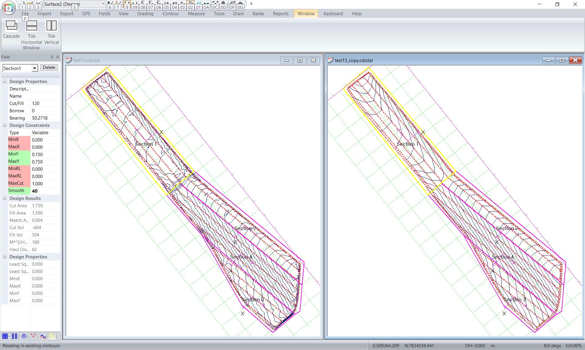 We have been given some data and have imported it to create the following job. You will notice that the data points picked up are relatively close together. However the rows are a relatively large distance apart. The surface along a row is fairly well defined. However we have no idea of the surface between rows. All we can assume is that the surface is a constant slope between rows. In the screen shot below we have the natural surface on the left and you can see the design surface on the right. The design is segmented due to the lack of data between the rows.