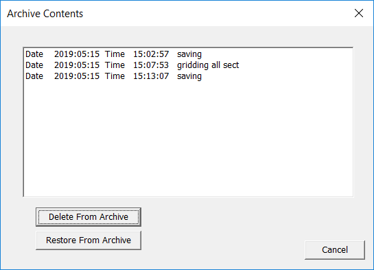 You will see that one of the entries says "gridding all sect". You can come here at anytime - select this entry and click on "Restore from Archive". We are returned to the state of the job before we did the gridding.