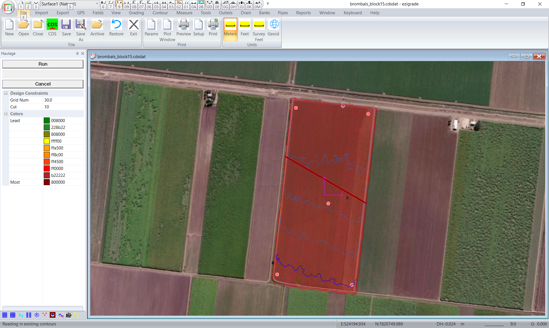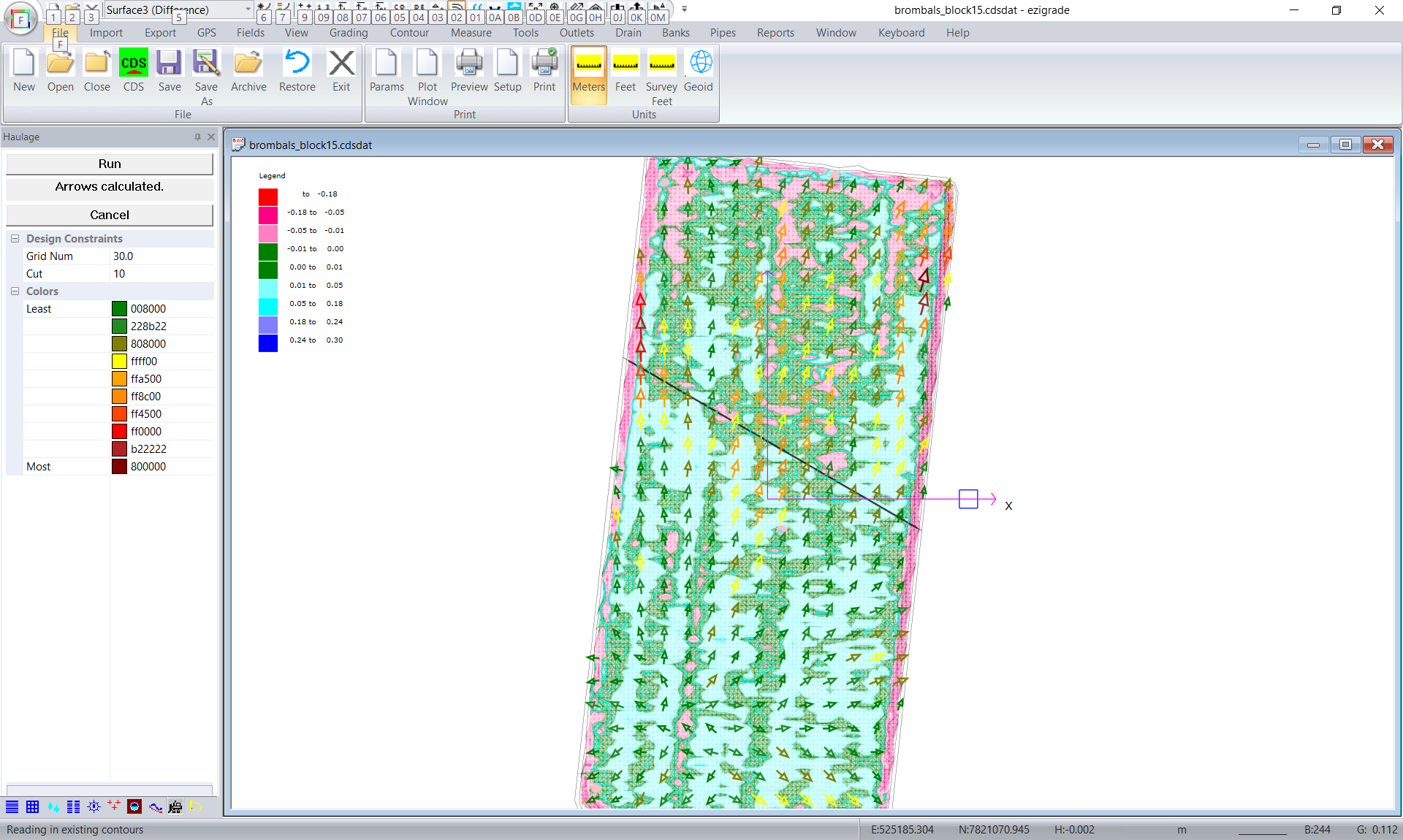The Haulage arrows give a visual representation of the best way to move dirt around within the job. At present it will not account for import/export of dirt from the field. The arrows are graded from most dirt to least dirt. The idea is to give feedback on how best to move dirt around to minimise the distance dirt needs to be moved.