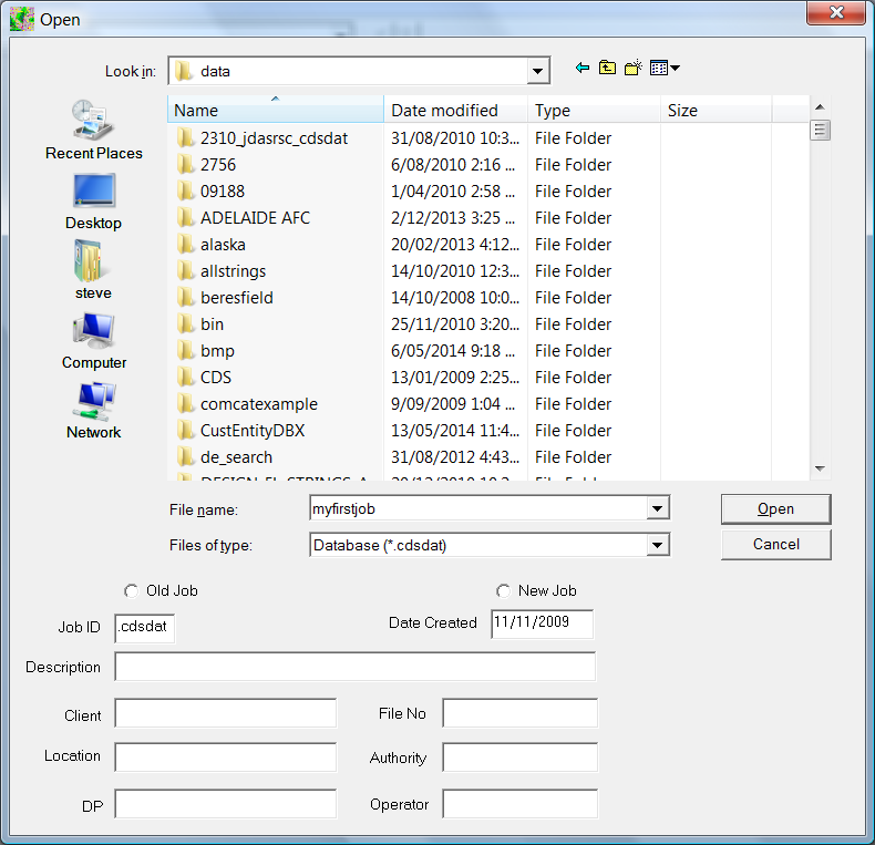 This prompts you for a folder and a file name. The empty "Ezigrade" job is created. In the example below we wish to create a job called "myfirstjob" and place it in the "c:\data" folder that is an existing folder on this computer. There are a couple of extra fields that are optional. These may help when browsing five year old jobs and wondering who the client was, the location etc .