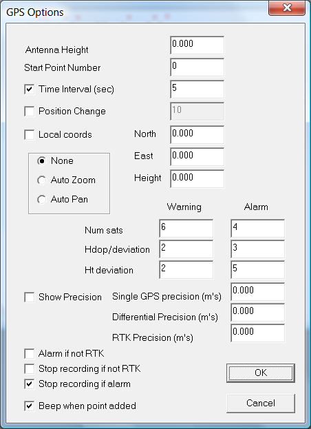 The rest of the details allow you to set warnings and alarms on the data coming in. It is important to make sure these are set to your requirements. For example it is probably important to stop recording if RTK is not present.