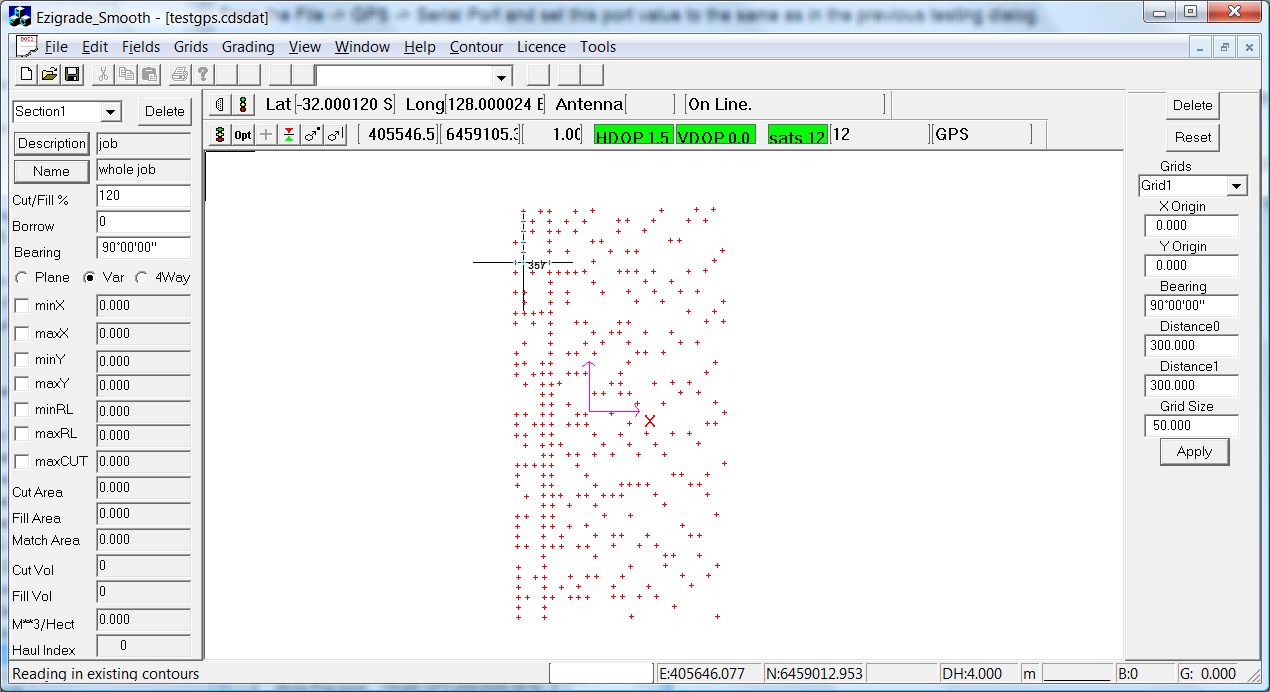 This now imports the data from the serial port depending on the options set. The small black cursor is the GPS position. We also have a new indicator bar that gives us current lat/longs number of satellites etc. The data at present is automatically converted to UTM coordinates at present. If you are from the States and you need State Plane then let us know and we will get it implemented.