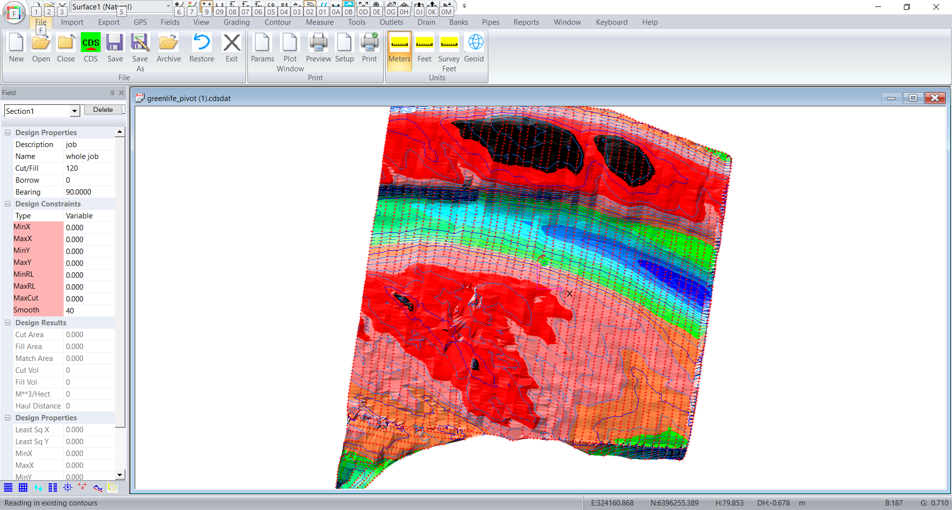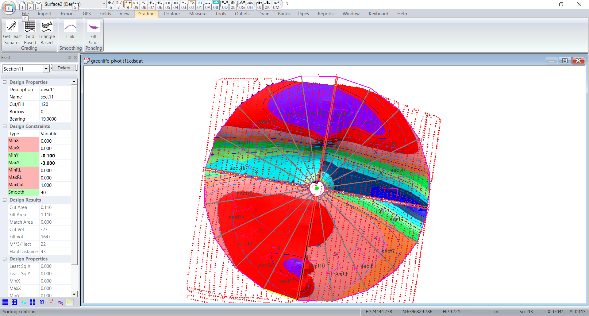 Our design brief is to grade around a pivot. We are going to have an access road running North-South and a drain running West-East. Ezigrade doesn't support circular arcs in sections. However the more you split up a circle into chords then the more it approximates a circle.