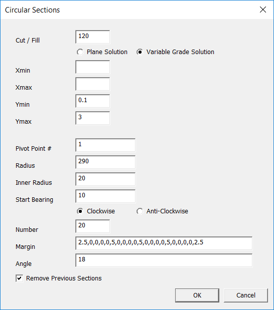 So for sections 1 ~ 5. The Y axis is pointing clockwise. If we want the water to flow this way then the Y grades need to be negative. So for sections 1 ~5 I have set the MinY -0.1 and MaxY to -3. Sections 11 ~ 15 are set the same. Sections 6 ~ 10 and Sections 16 ~ 20 are set as minY 0.1, maxY 3. These values will be set up correctly from the dialog.