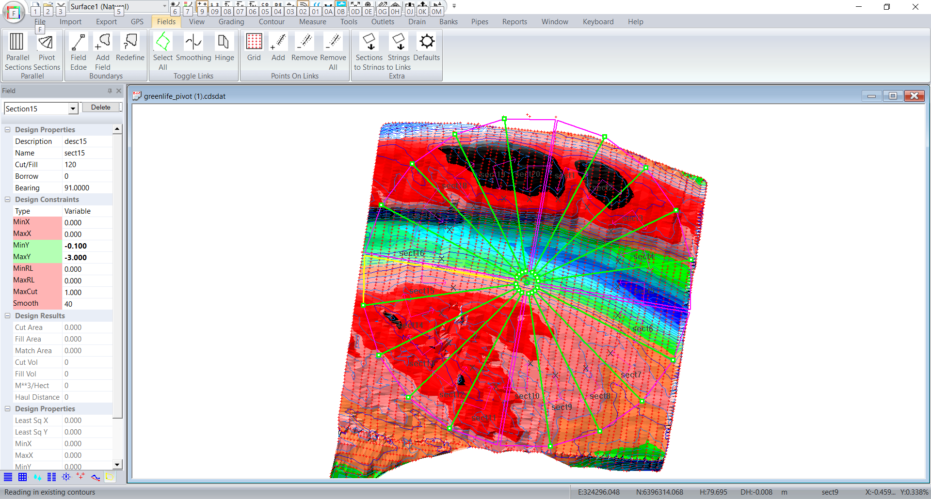 This tutorial describes the process of creating sections around a pivot point. This is for when we wish to force the water to flow around the pivot. For example you may have furrows with vegetables or as in this case we have a Turf farm design. In this case when the turf is established then the water can flow off the field. In this case we are going to design a drain across the center of the design. However when they harvest the turf they harvest around the pivot and leave a thin strip of turf. The next crop grows back from these strips. However the strips left stop the water flowing cross-wise so we need to make sure that the water will flow around the paddock into the drain.