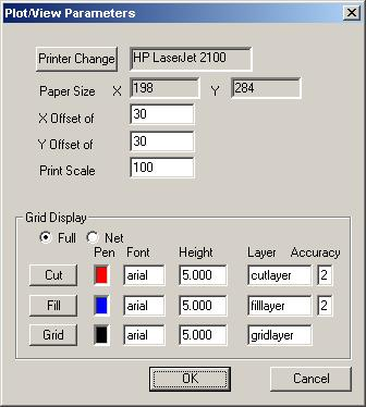 Additionally you need to fill in the "Plot Parameters" screen. From the "File" menu click on the "Plot View Parameters" menu item. This dialog as seen below; allows you to move the plot around the screen as well as setting the scale of the plot. We suggest you try origin values and scales until you find a scale that is appropriate.At present the layer edit box is ignored in the cut - fill - grid layer box. If and when we create a dwg file this will be included.
