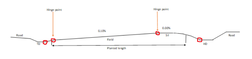 This tutorial shows you how to design and create an irrigated structure which contains a head ditch and a tail drain. We also go onto show how to balance the earthworks between the three structures. To balance earthworks we want to move the field and the sill up and down while everything else stays where it is. A profile view of what we are trying to achieve is as follows: